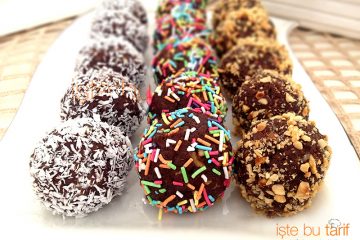 Bisküviler kırılır. İri parçalar kalmamasına dikkat edilir. Tereyağ eritilir. İçine şeker katılıp karıştırılır. Tereyağlı karışım ve diğer malzemeler bisküvilere eklenip, iyice karıştırılır. Ceviz büyüklüğünde toplar yapılır. Dışı kakaoya bulanır. 1-2 saat buzdolabında bekletilir. Kürdan batılarak servis edilir. (Yaklaşık 20 adet top çıkıyor.) ![]() Kakaolu Toplar Bizi instagramdan @istebutarif adıyla takip edebilirsiniz. |